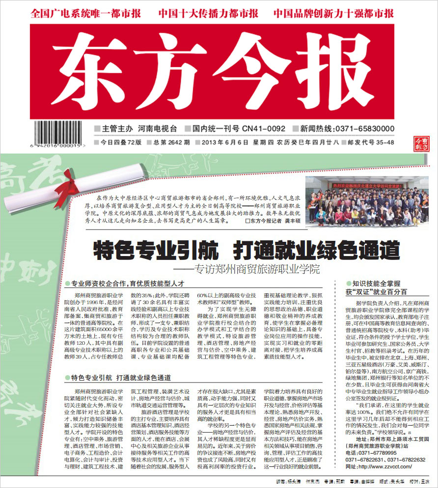 在作为大中原经济区中心商贸旅游都市的省会郑州,有一所环境优雅,人文气息浓厚,以培养商贸旅游复合型、应用型人才为主的全日制高等院校——郑州商贸旅游职业学院。中原文化的深厚底蕴、浓郁的商贸气息成为她发展壮大的助推力。数年来无数优秀人才从这儿走向知名企业,去书写更高更广的人生篇章。□东方今报记者 龚丰硕