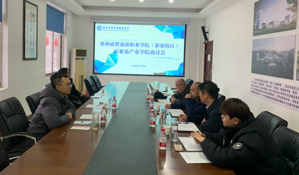 1月18日下午,我校比亚迪产业学院商讨会在新密校区二楼会议室召开,比亚迪集团校企合作经理杨双喜、比亚迪郑州人事科科长任永斌莅临指导,党委副书记郭宝宪、教务处处长黄智科、机电工程学院院长王奎英、教务处实训科副科长孙野、机电教学秘书姜金玲参会,会议由教务处处长黄智科主持。