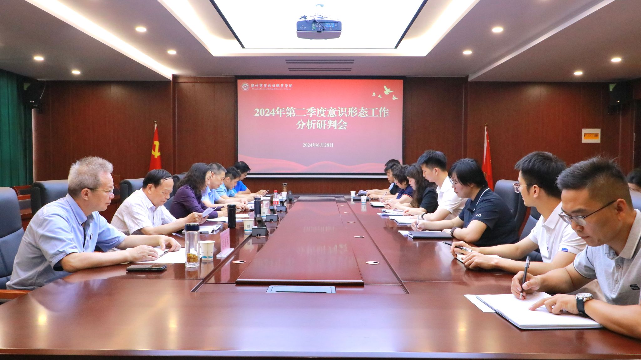 为进一步加强学校意识形态工作,切实维护校园和谐稳定,6月28日,我校在图书馆四楼会议室召开2024年第二季度意识形态工作分析研判会。学校党政领导班子、各部门负责人参加会议。