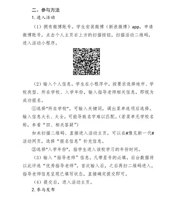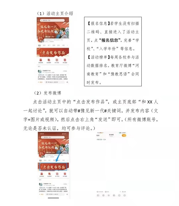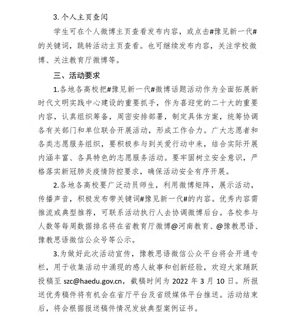 1.各地市、各学校通过官方微博积极关注河南省教育厅政务微博@“河南教育”或“豫教思语”,积极参与#豫见新一代#话题讨论。建立各地市、高校工作群,协同做好本地、本校内的微博矩阵建设和运营工作,加强宣传和联动,组建辐射范围广、延伸触角深的网络思政新媒体矩阵。