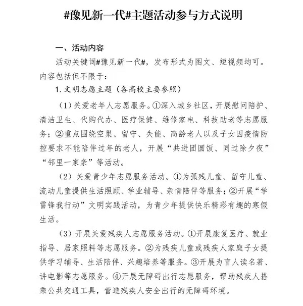 为深入学习贯彻落实习近平总书记关于青年学生理想信念的重要论述,持续贯彻落实“四史”学习教育有关要求,引导新一代青少年在学思践悟中坚定理想信念、在奋发有为中践行初心使命,迎接党的二十大胜利召开,结合省文明办《关于2022年元旦春节开展志愿服务关爱行动的通知》要求,省委高校工委、省教育厅决定在寒假期间开展“豫见新一代”主题教育实践活动。现将活动有关事项通知如下: