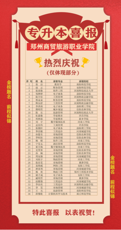近日,2024年专升本考试录取结果陆续公布,我校张洁、赵云、张亚格等291位同学分别被河南财经政法大学、华北水利水电大学及郑州航空工业管理学院等心仪院校录取,踏上求知追梦的新征程。在此,对我校成功上岸的学子们表示衷心祝贺,实现从专科到本科的华丽转身!同时也希望在校的广大学子继续努力,续写佳绩!