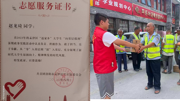 赵龙琦,2023年暑期服务于河南省洛阳市孟津区平乐镇平乐社区党群服务中心,主要负责协助村(社区)完成基层工作,如:负责督促每周的社区清理;全镇的改厕信息统计;接待新人做工作交接;社区便民打印、日常资料填写等等。通过此次暑期实践,他提升了自己的沟通能力和团结协作能力,以青春之名奉献社会。