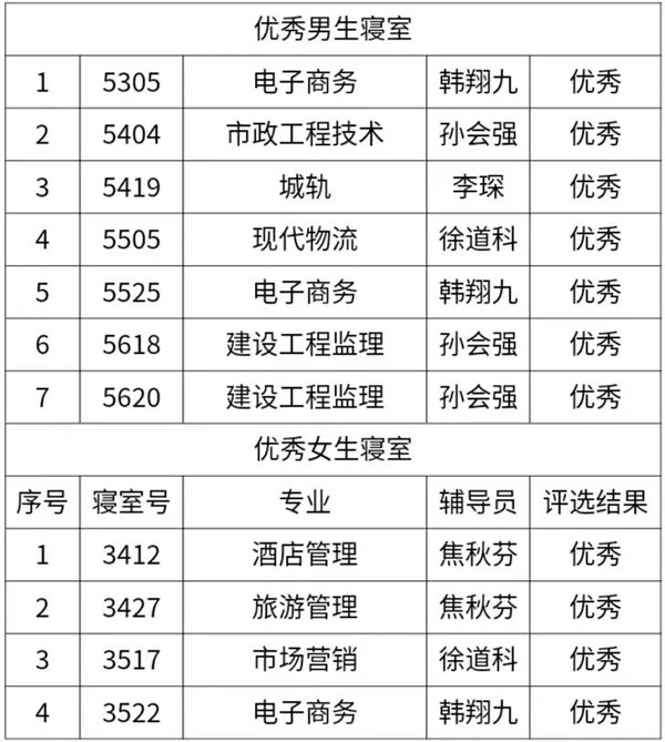 在此次活动中取得优秀文明寝室13个、优秀班级4个,分别是以下: