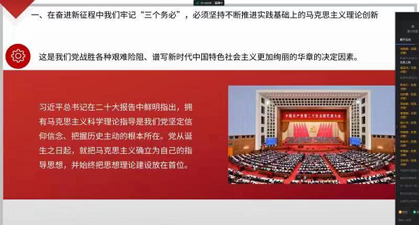 为深入学习贯彻党的二十大精神,把马克思主义中国化时代化最新理论成果落实到思政课教学实践中,推动二十大精神进教材、进课堂、进学生头脑,激发学生爱党爱国之情,在校党委的统筹安排下,我校思政教学部成立思政课教师宣讲团,在近期深入开展党的二十大精神宣讲活动,通过线上线下相结合的方式实现宣讲全覆盖,持续推进党的二十大精神落地生根。