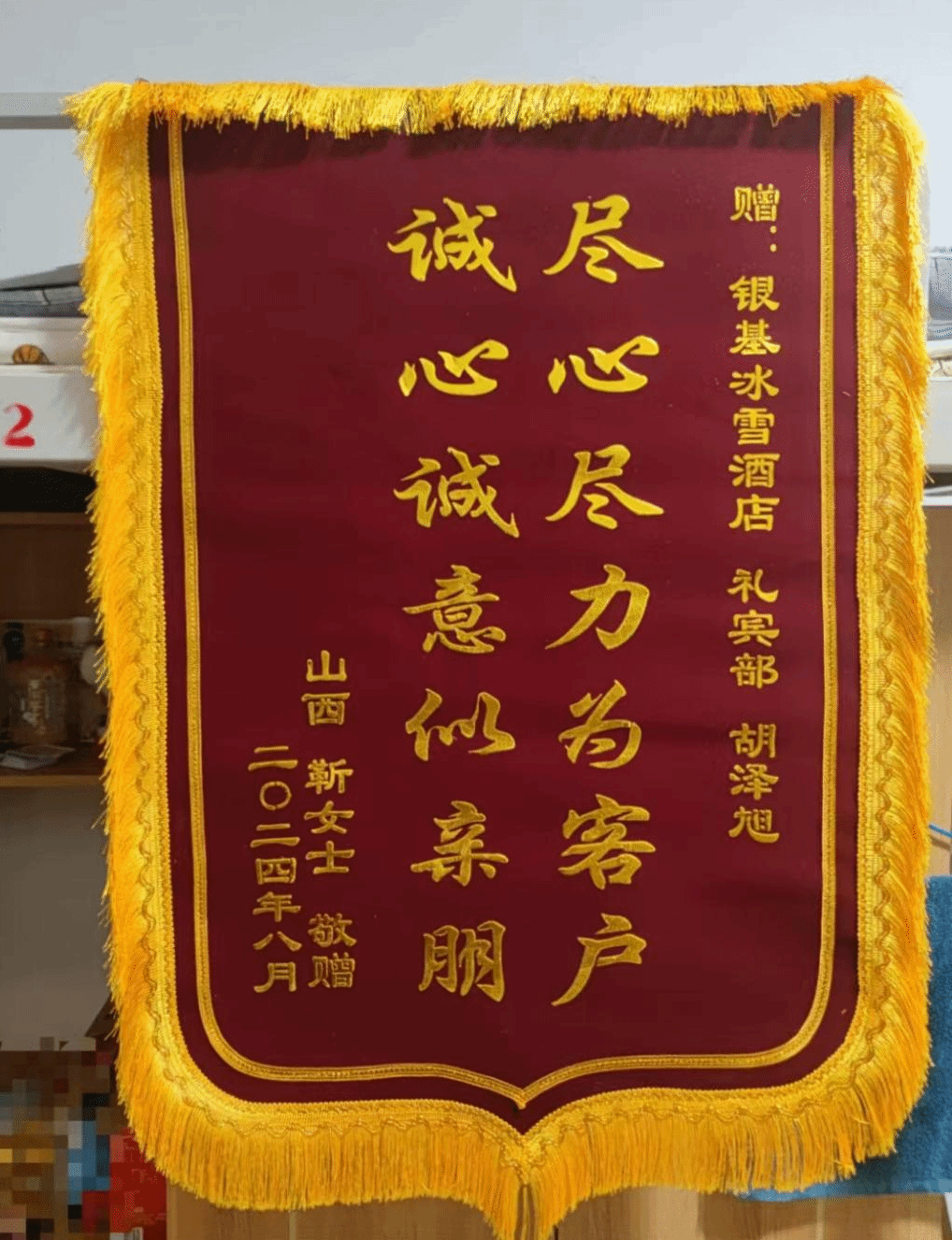 8月23日,一位山西的客人把包遗失在酒店,实习生胡泽旭细心耐心的帮客人找丢失的包,最后在酒店的一家餐厅中找到了包并邮寄给了客人。客人收到包后,专门制作了锦旗邮寄到银基冰雪酒店,送给实习生胡泽旭。