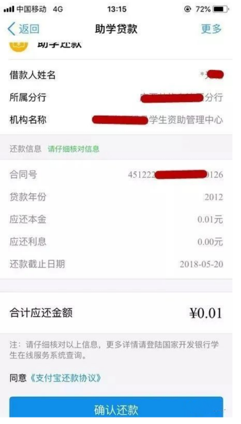 (1)使用支付宝国家助学贷款还款功能还款。