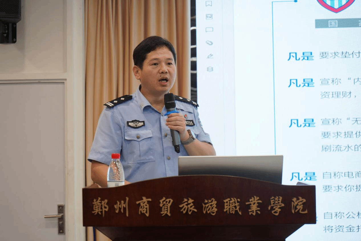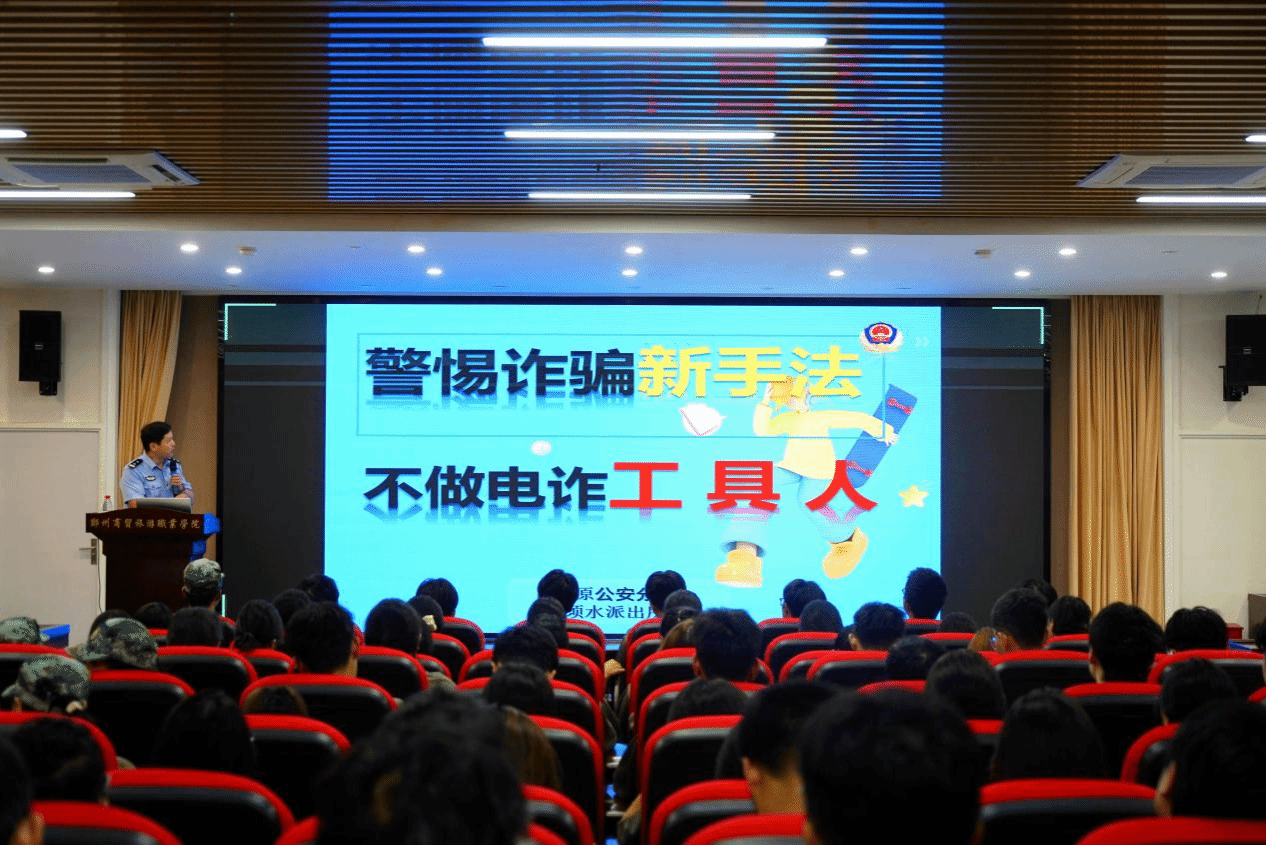 为落实学校关于新生安全教育的工作要求,切实增强新生的安全意识和防范电信网络诈骗的能力,9月19日下午,我校邀请郑州市公安局中原分局须水派出所所长韩卫林警官,在中原校区报告厅为大一新生开展“新生入学教育——防电信诈骗”专题讲座,各教室同步观看视频转播。人文旅游学院、人工智能学院2024级全体新生和辅导员老师参加本次讲座。